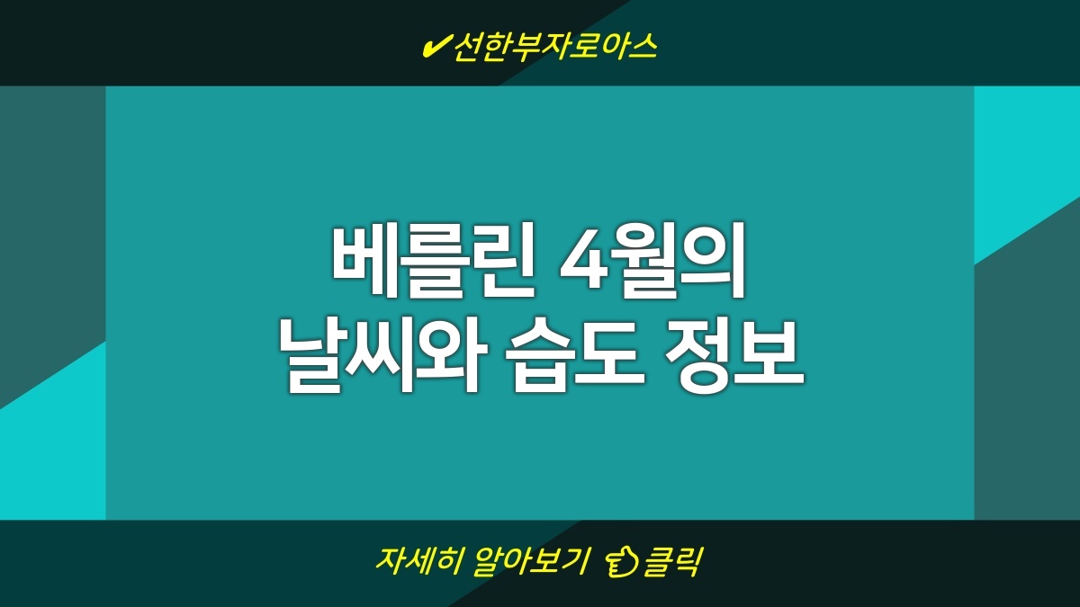 베를린의 4월 평균 기온은 10도에서 15도 사이로 오른다. 아침이나 저녁은 기온이 낮아서 따뜻한 옷이 필요하다. 평균 습도는 75%로, 날씨가 흐리거나 비가 오는 날에는 습도가 더 올라갈 수 있다. 준비를 철저히 하면 날씨에 구애받지 않고 여행을 즐길 수 있다. 준비물을 잘 챙기면 날씨 변화에도 잘 대처할 수 있어.