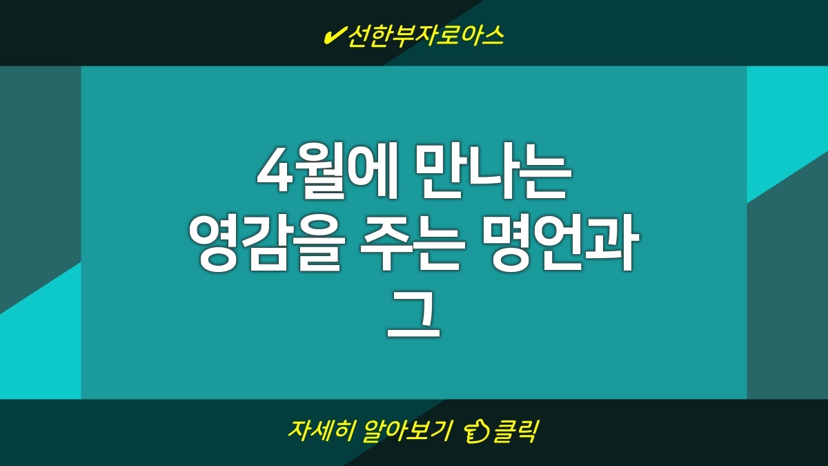 명언은 단순한 글귀를 넘어 우리 삶에 큰 영향을 미치는 자원이 될 수 있습니다. 이 4월의 명언들을 통해 우리는 자신을 되돌아보고, 더 나은 삶을 위한 동기를 부여받을 수 있습니다. 매일의 작은 변화가 모여 큰 성장을 이루듯이, 명언에서 얻은 지혜를 통해 인생의 다양한 상황을 극복하고 희망을 잃지 않는 삶을 살아가길 바랍니다. 이 명언들을 자기만의 방식으로 실천하며 삶의 변화를 이끌어 보세요.